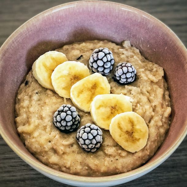Das fertige Porridge garniere ich mit der restlichen Banane und hier ein paar gefrorenen Brombeeren.