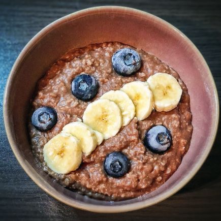 Das fertige Porridge garniere ich mit der restlichen Banane und hier ein paar gefrorenen Brombeeren.