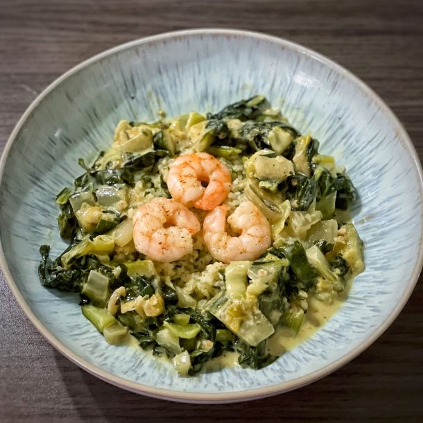 Bulgur mit Mangold-Rahmgemüse und Garnelen
