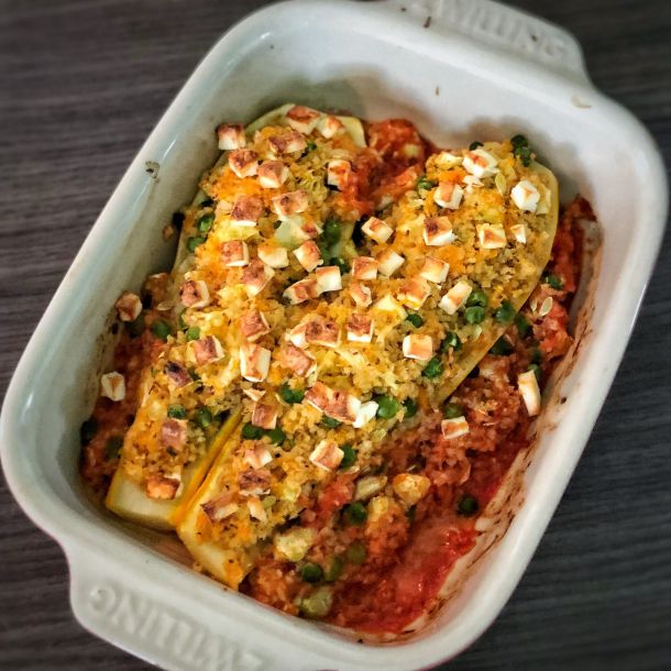 Die Zucchinihälften dann hineinlegen und mit der restlichen Mischung füllen