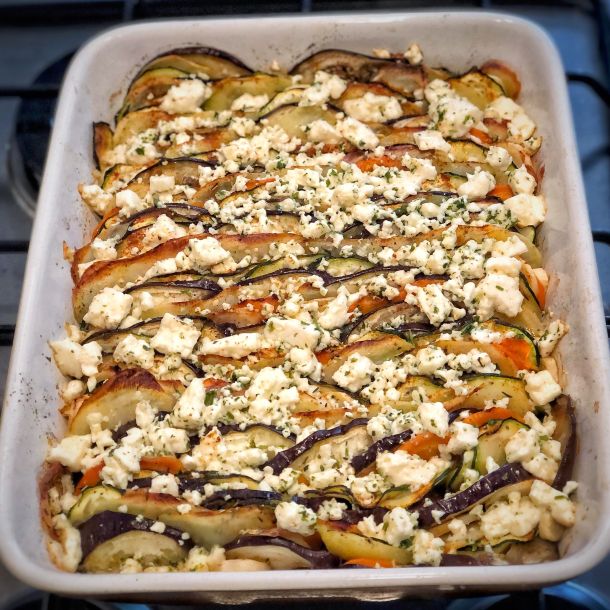 10 Minuten vor Ende der Garzeit den Feta darüber bröseln, sodass alles schön gratiniert.