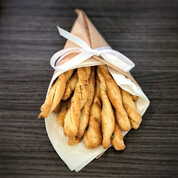 Nach der Ruhezeit die Teigstangen ca. 10 Minuten backen bis sie goldbraun sind. Anschließend gut auskühlen lassen.