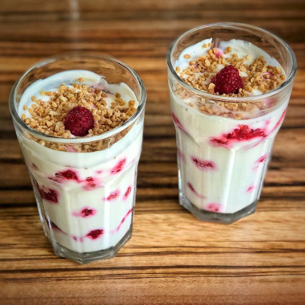 Den Magerquark mit dem Joghurt cremig aufschlagen und nach Belieben mit Ahornsirup oder einer Alternative (Honig, Agavendicksaft, Zucker, etc…) süßen.