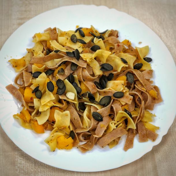 Während der Kürbis gart, die Nudeln nach Packungsanweisung in Salzwasser kochen, bis sie al dente sind. Ich habe zweierlei Bandnudeln verwendet, Dinkelpasta und normale.