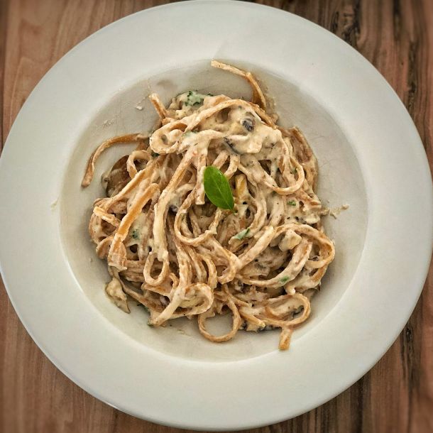 Die Pasta abgießen und samt ein wenig Nudelwasser in die Pilzsoße geben, verrühren und final abschmecken.