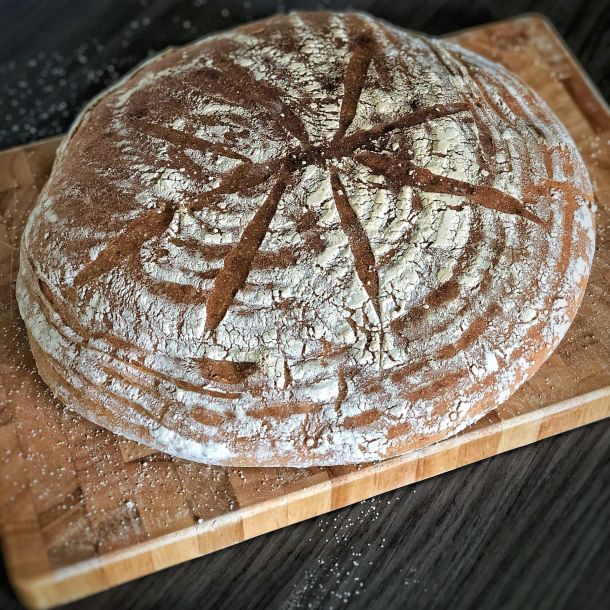 8. Den Laib auf das Backblech stürzen mit einem spitzen Messer mit einem Muster der Wahl einschneiden und dann für ca. 40 Minuten backen.