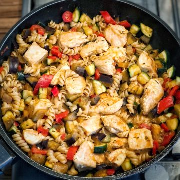 Pasta mit Gemüse-Sahne-Soße und Lachs